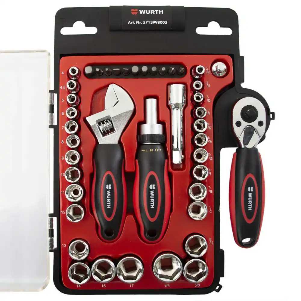 Veoma praktičan kombinovani set nasadnih ključeva i umetaka sa račnom,podesivim ključem, odvijačem sa račnom i prihvatom za nasadne ključeve i umetke.