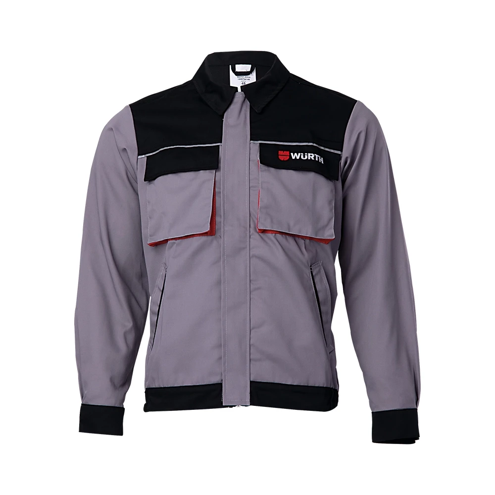 Radna jakna svetlo sive boje sa crno-crvenim detaljima ravnog kroja, sa klasičnom kragnom.