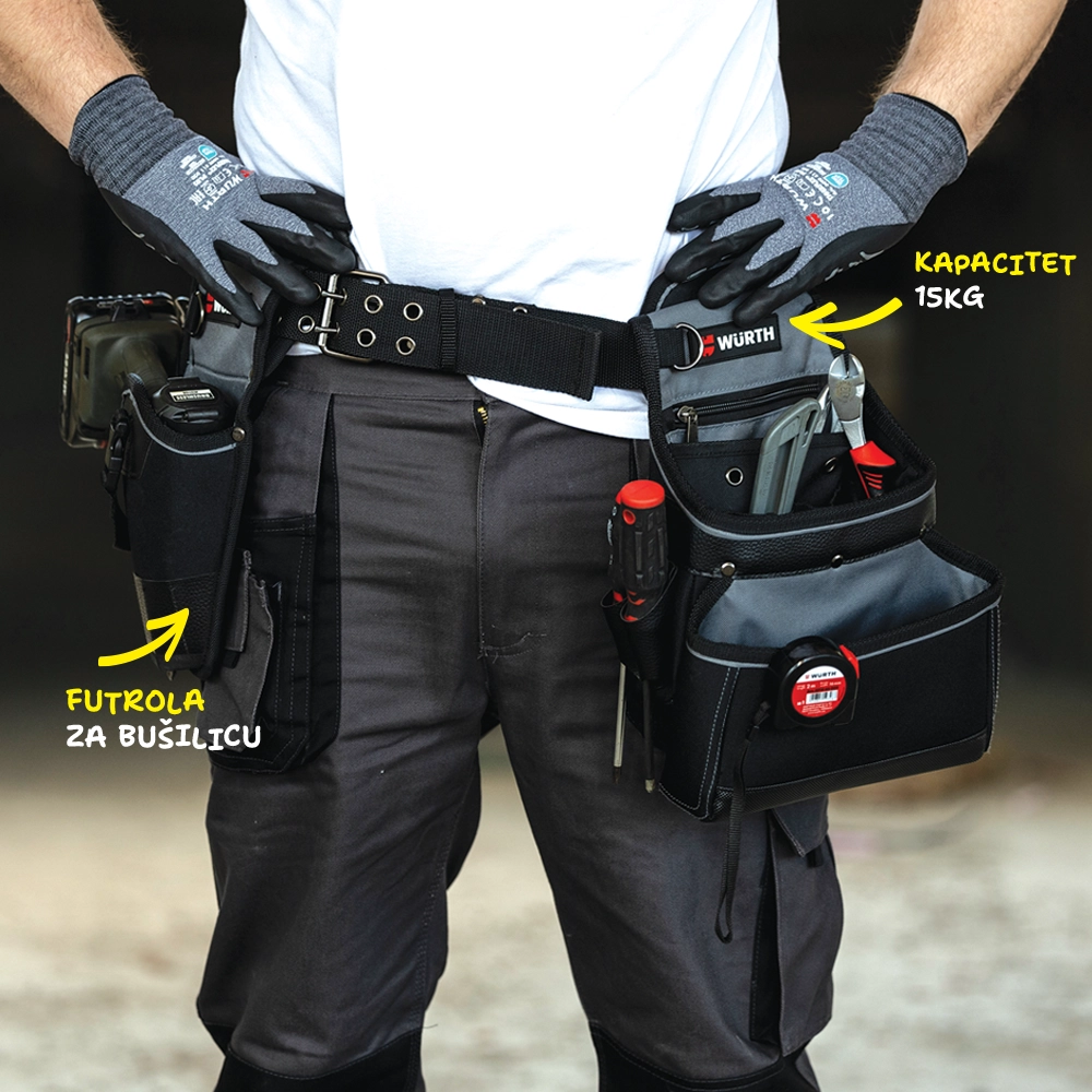 Višenamenski sistem opremeDolazi u kompletu sa futrolom za bušilicu, prstenom za čekić i višenamenskom torbicom.
