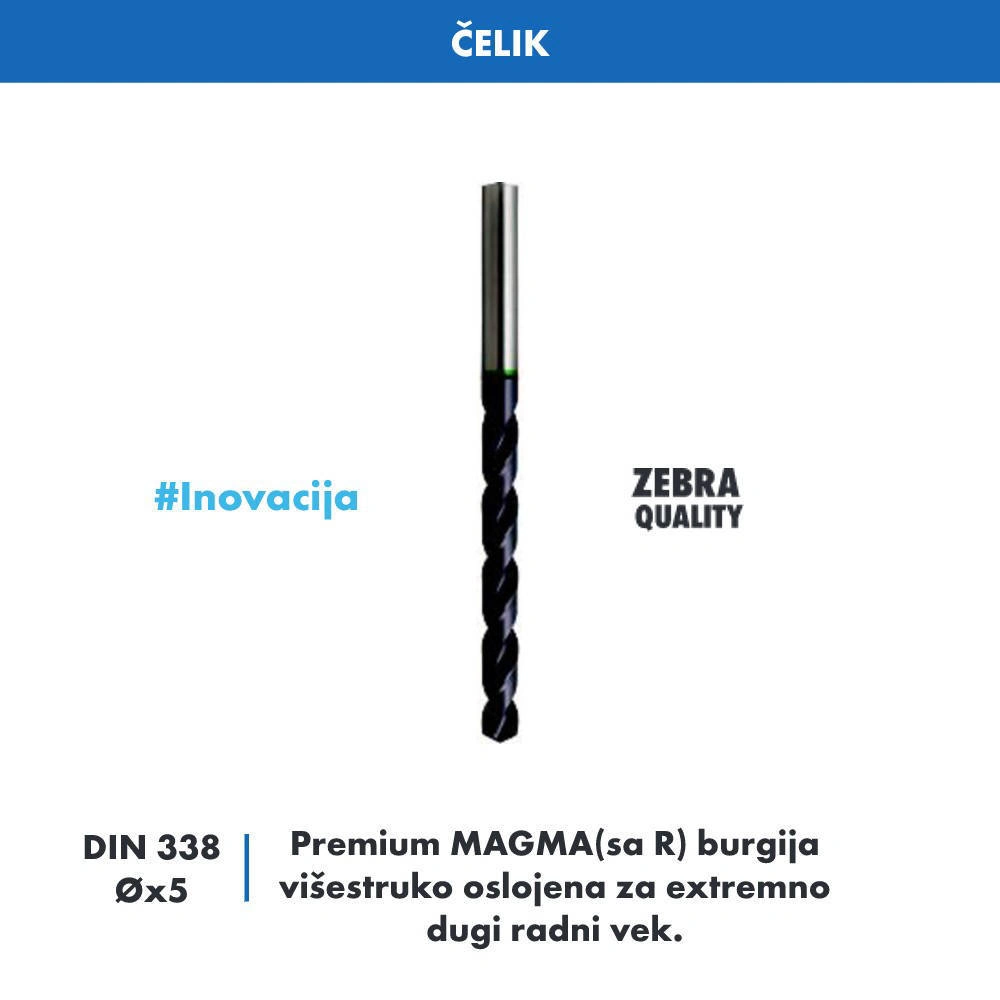 MAGMA burgija sa sadržajem kobalta od 5-8%, optimizovana za maksimalne performanse u serijskim procesima bušenja čelika i prohromskih čelika do 1200 N/mm2 (~38 HRC). Geometrije prema standardizaciji DIN 338, Ugao vrha od 130˚- unakrsno brušen (oblika C). N tip (30˚)ugao zavojnice - optimalno odvođenje strugotine i smanjenje trenja.Konusna geometrija jezgra – veća preciznost i stabilnost. MAGMA površinska zaštita – višeslojno oslojavanje sa titan nitridom i titan aluminijum nitridom otpornost na habanje i visoku temperaturu do 800˚C