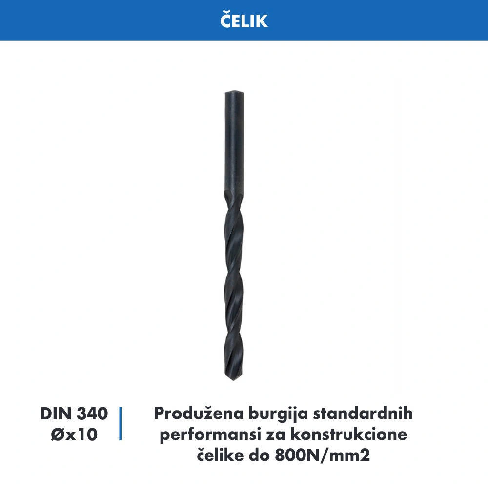 HSS spiralna burgija produžene geometrije prema standardizaciji DIN 340 (maksimalna dubina bušenja ΦD x10). Proces izrade – brušenjem. Namena, za čelike do 800 N/mm2(~23 HRC). Ugao vrha od 118˚(oblika A) potrebno obeležavanje tačkašem na cilindričnim površinama. N tip (30˚)ugao zavojnice - optimalno odvođenje strugotine i smanjenje trenja. Kaljena u pari - površinska obrada, zaštitni sloj od 5 µm fero oksida, boja crna.