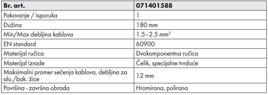 Ergonomska ručica za bezbednu i udobnu upotrebu, dvokomponentna neklizajuća ručica sa VDE zaštitom.Ojačana i precizna sečiva na kleštimaHromirana i polirana površinaPodručje primene:Za okrugle kablove promera 8-12mm,
