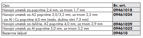 Za nitovanje pop-nitni od aluminijumske legure, bakra, čelika i plemenitog čelika prečnika 2,4 mm, 3 mm i 4 mm i pop-nitni od aluminijumske legure prečnika 5 mm.