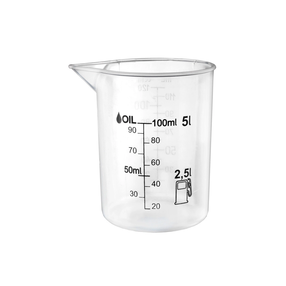 Merica za ulje od visokokvalitetnog polietelena, sa dve skale ( utisnute i štampane crnom ), odnos mešanja 1:50, praktična pomoć za dvotaktne mešavine, otporne na goriva, ulja i kiseline.