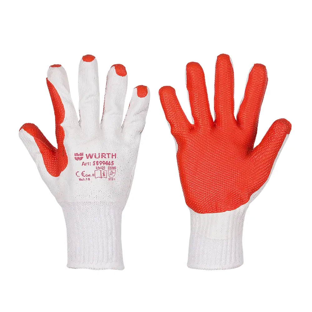 Rukavice pletene od mešavine pamuka i poliestera, bešavne. Čvrsta guma zalepljena na dlan rukavica omogućava dodatnu bezbednost u radu sa grubim materijalima.