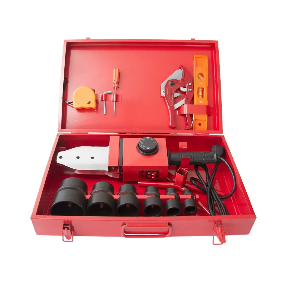 Komplet dolazi sa kalupima za cevi prečnika 20, 25, 32, 40, 50 i 63 mm, kao i alatima koji olakšavaju svaki korak procesa – uključujući alat za montažu, meru traku dužine 3 m, makaze za sečenje PVC cevi i magnetnu libelu dužine 22,5 cm za precizno nivelisanje. Isporučuje se u čvrstoj metalnoj kutiji, što omogućava jednostavan transport i organizaciju.