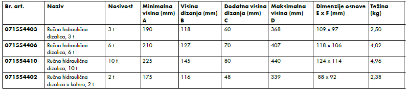 Napomena: pakovanje u koferu samo za dizalicu od 2t.