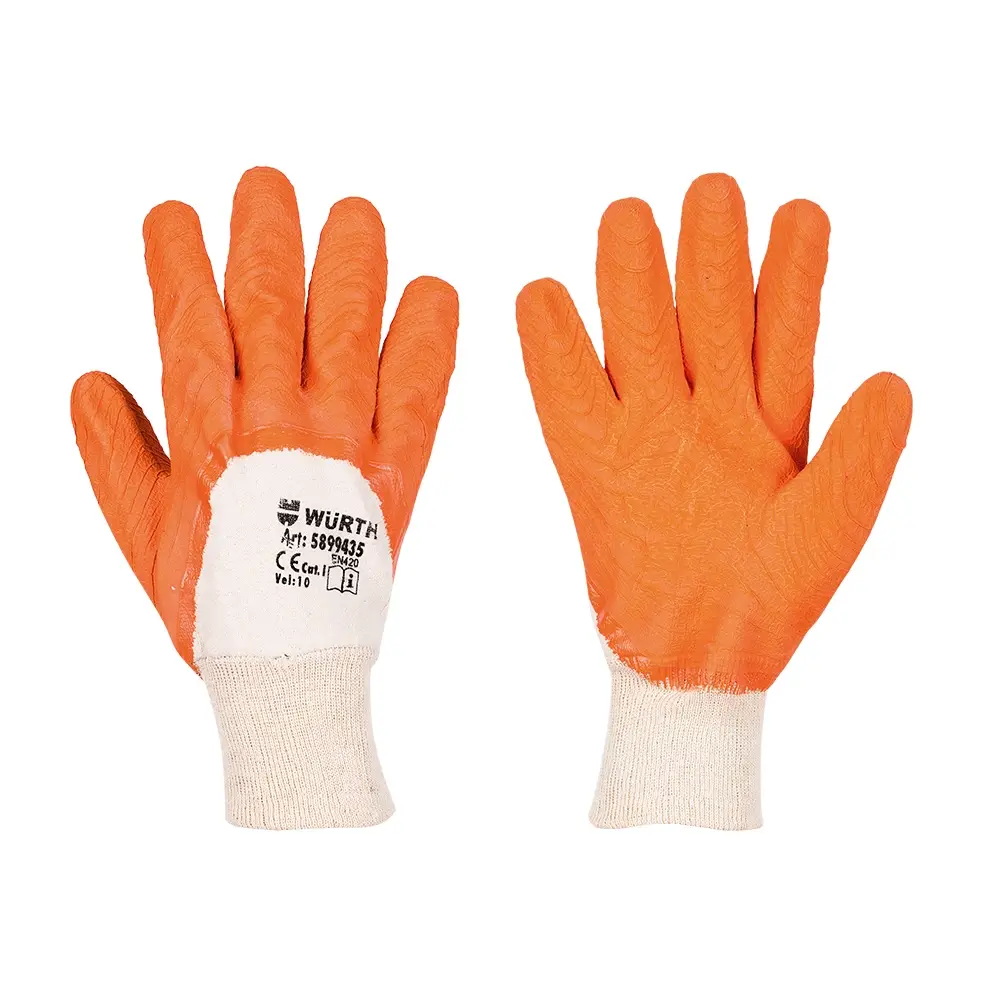 Duplo močene bešavne rukavice. Osnova izrađena od pamuka (žersej), prevlaka od naboranog lateksa koji pokriva dlan i prste. Otvorena nadlanica omogućava disanje kože.