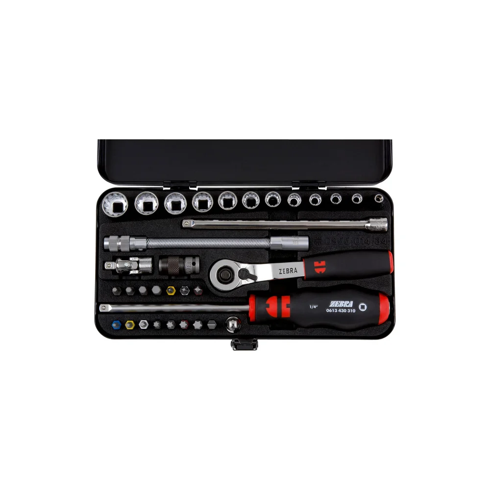 Set nasadnih ključeva u ZEBRA kvalitetu 1/4" 6-ugaonih nasadnih ključeva sa račnom, 42 komada. Isporuka je u metalnoj kutiji i ulošku od kvalitetnog penastog materijala sa efektom stezanja.