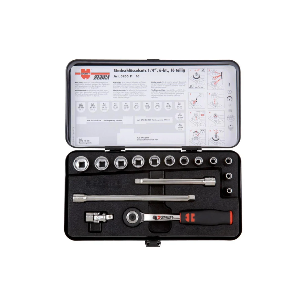 Set nasadnih ključeva u ZEBRA kvalitetu 1/4" 6-ugaonih nasadnih ključeva sa račnom, 16 komada. Isporuka je u metalnoj kutiji i ulošku od kvalitetnog penastog materijala sa efektom stezanja.