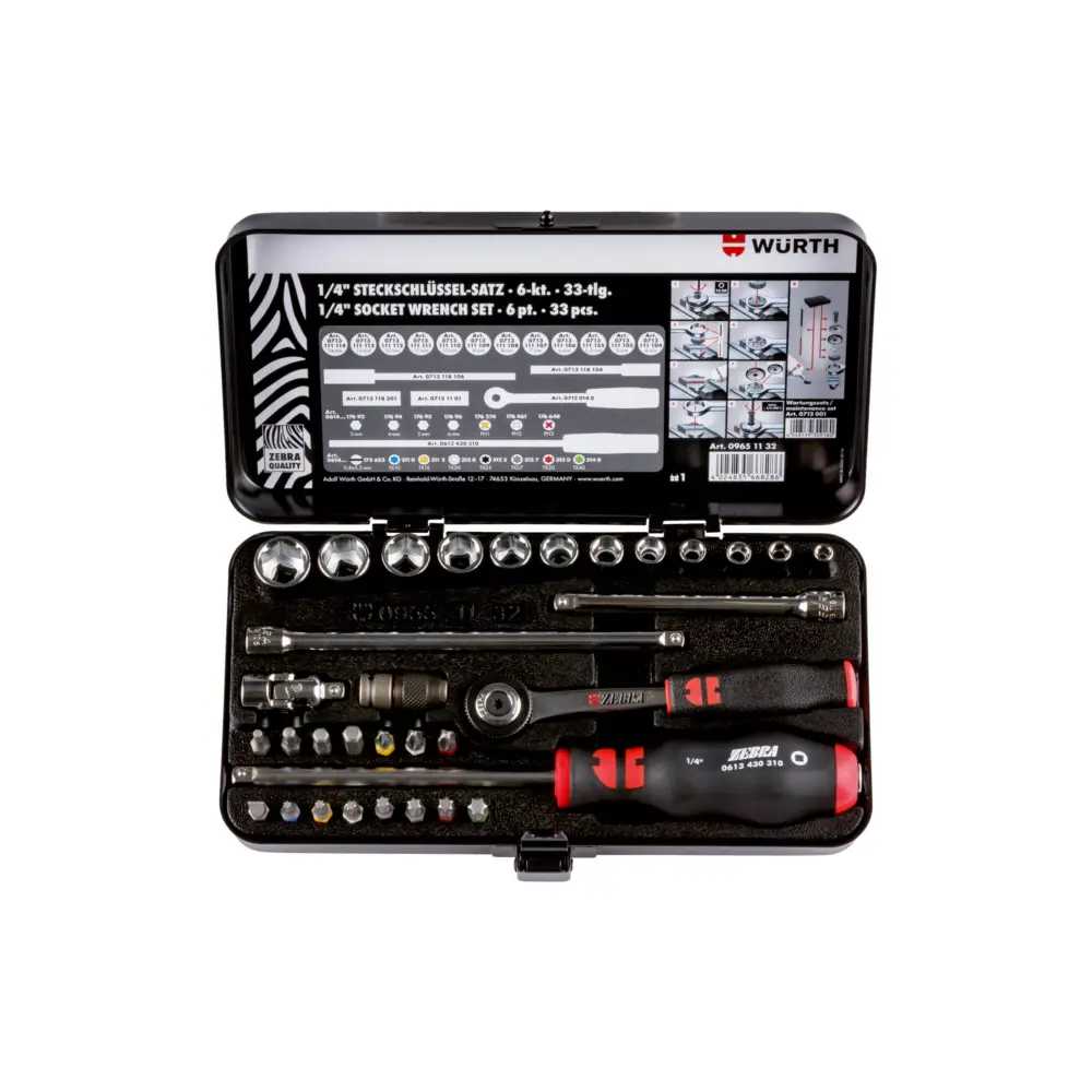 Set nasadnih ključeva u ZEBRA kvalitetu 1/4" 6-ugaonih nasadnih ključeva sa račnom, 32 komada. Isporuka je u metalnoj kutiji i ulošku od kvalitetnog penastog materijala sa efektom stezanja.